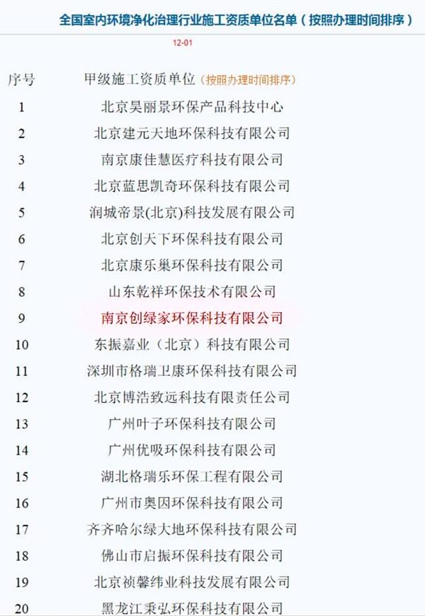 恭喜南京創綠家環??萍加邢薰精@得全國室內環境凈化治理行業甲級施工資質證書!!!目前全國室內環境凈化治理行業具有甲級施工資質的企業僅有20家,創綠家是第九位獲得全國甲級施工資質的公司! 此外,創綠家環保科技有限公司還是中國室內裝飾協會室內環境凈化治理委員會會員單位、中國建筑室內生態環境綜合研究課題承擔企業、全國室內車內環境凈化治理先進單位!