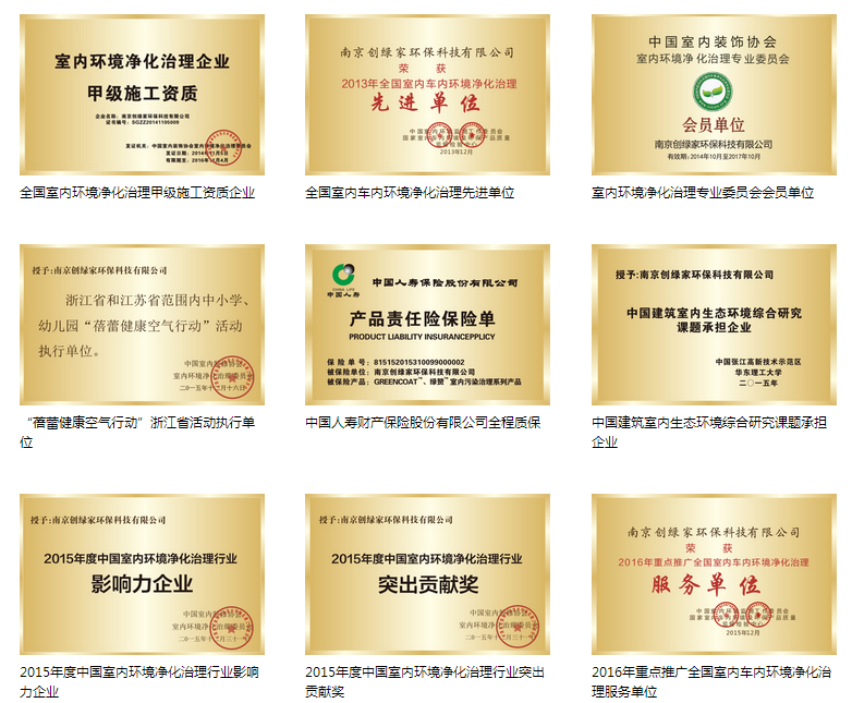 品牌不僅被央視納為宣傳推薦品牌,更是在2012年獲得了中國室內環保凈化產品十佳品牌,同時,創綠家被評為中國中輕質量信譽雙保證重點推薦單位,室內環境檢驗治理達標單位,并擁有室內環境污染治理證書,被評為全國環保行業質量放心、消費者***品牌!