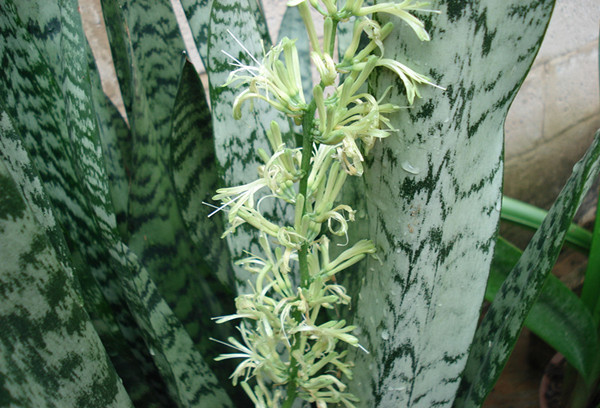 葉簇生,劍葉剛直立,葉全緣,表面乳白、淡黃、深綠相間,呈橫帶斑紋。常見的家庭盆栽品種,耐干旱,喜陽光溫暖,也耐陰,忌水澇。可吸收室內80%以上的有害氣體,吸收甲醛的能力超強。
