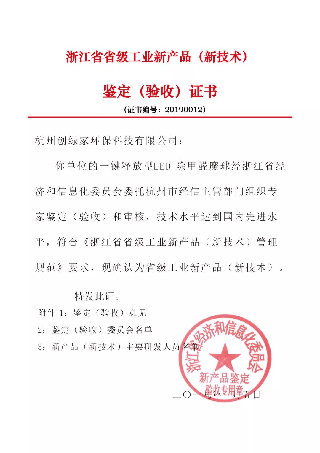 創(chuàng)綠家環(huán)保旗下明星產(chǎn)品搖一搖除甲醛魔球經(jīng)浙江省經(jīng)濟和信息化委員會委托杭州市經(jīng)信主管部門組織專家鑒定(驗收)和審核,技術水平達到國內(nèi)先進水平,符合《浙江省省級工業(yè)新產(chǎn)品(新技術)管理規(guī)范》要求,現(xiàn)確認為省級工業(yè)新產(chǎn)品(新技術)。