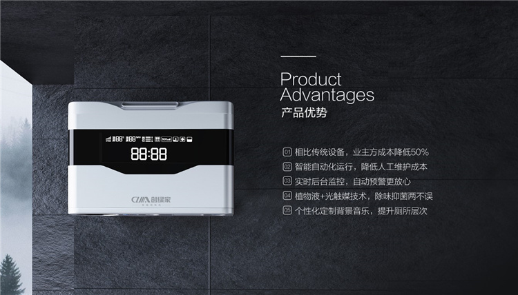 杭州創綠家環保科技有限公司副總裁兼技術總監許厚榮對創綠家新品作了主要介紹。本次發布的創綠家智能除味機,運用前沿的物聯網、大數據、云計算等技術,并融合光觸媒除菌、天然植物萃取液除味技術,能有效分解氨、硫化氫、甲硫醇等惡臭氣體分子,也起到了有效除菌的效果。最重要的是這款機器相比目前主流的廁所除味設備,能使業主方成本降低50%,有效降低人工維護成本,而且基于這是一款高度智能化的物聯網設備,可為業主方個性化定制背景音,對安裝該設備的所有廁所定制數字駕駛艙,每臺設備的狀態都可以遠程在線監控,可對接城市大腦數據接口。