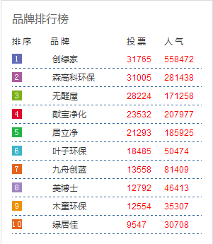 創綠家環保科技有限公司憑借著引進英國技術、自身研發的產品質量優勢,以及優質的治理團隊。在本屆室內除甲醛產品十大品牌的評選中,面對眾多在產品、技術以及服務上同樣出色的參選公司,創綠家卻最終贏得來自全國消費者的認可與好評。