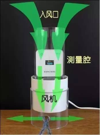 通電后,風機轉動時帶動氣體向下流動,將口罩套在入風口,在風機的作用下,氣體透過口罩從入風口進入測量腔中,分別測量通電前PM2.5濃度和口罩過濾后的PM2.5濃度。