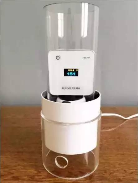 在一個約30平方米的密閉房間內,點燃香煙,模擬PM2.5高濃度環境。測得室內PM2.5原始值為50μg/m3,點燃1支香煙,室內PM2.5數值升至151μg/m3;將6款口罩用橡皮筋依次罩到風機口上,30秒后觀察PM2.5數值變化情況。
